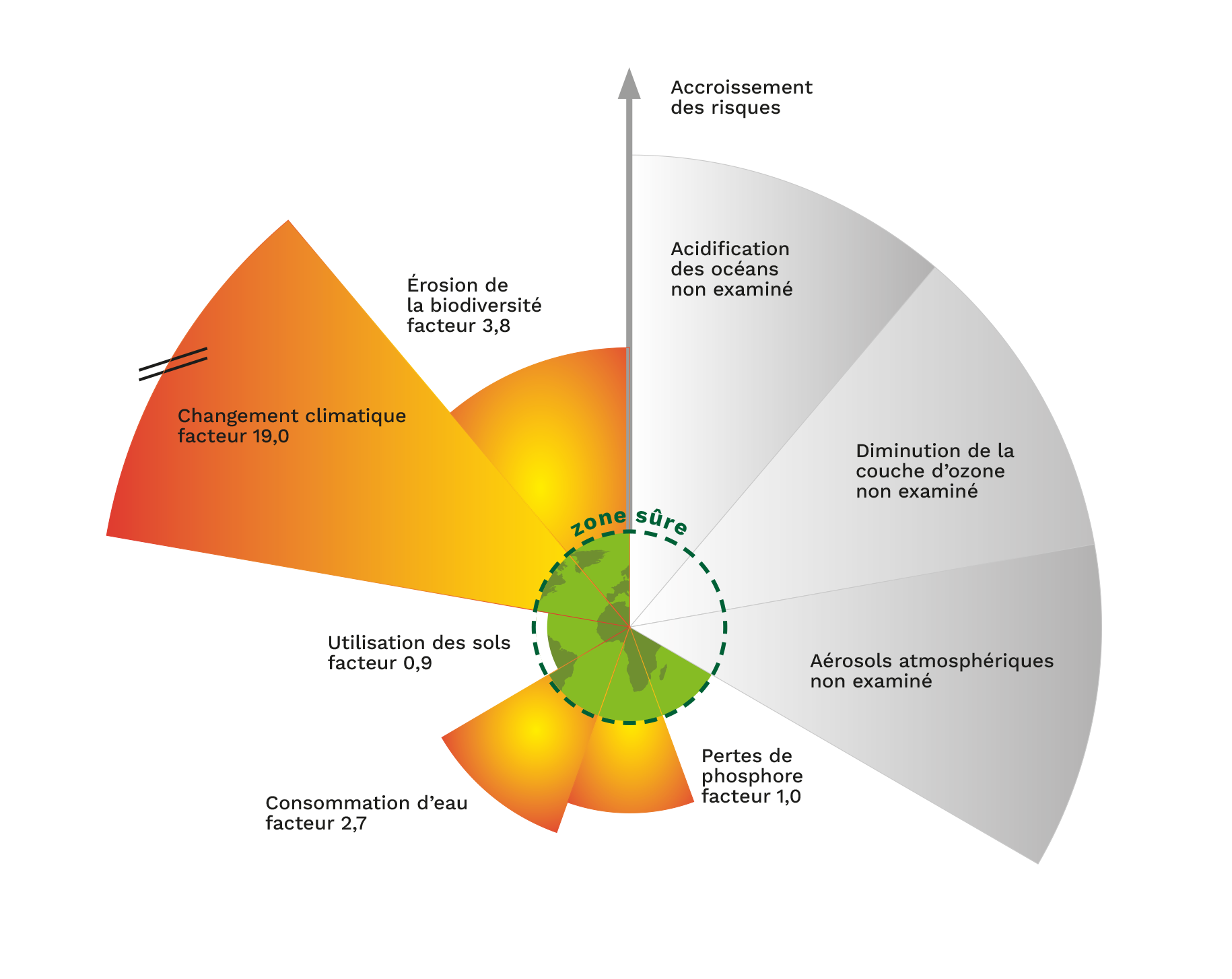 La Suisse dépasse largement les limites planétaires. Le concept de «limites planétaires» décrit le cadre dans lequel nous, les êtres humains, pouvons vivre en toute sécurité sur la Terre. Il comprend neuf dimensions écologiques telles que le changement climatique, l’effondrement de la biodiversité et la consommation d’eau douce. Le non-respect de ces limites dans une ou plusieurs dimensions exerce une telle pression sur les écosystèmes que la survie de l’humanité n’est plus garantie.
